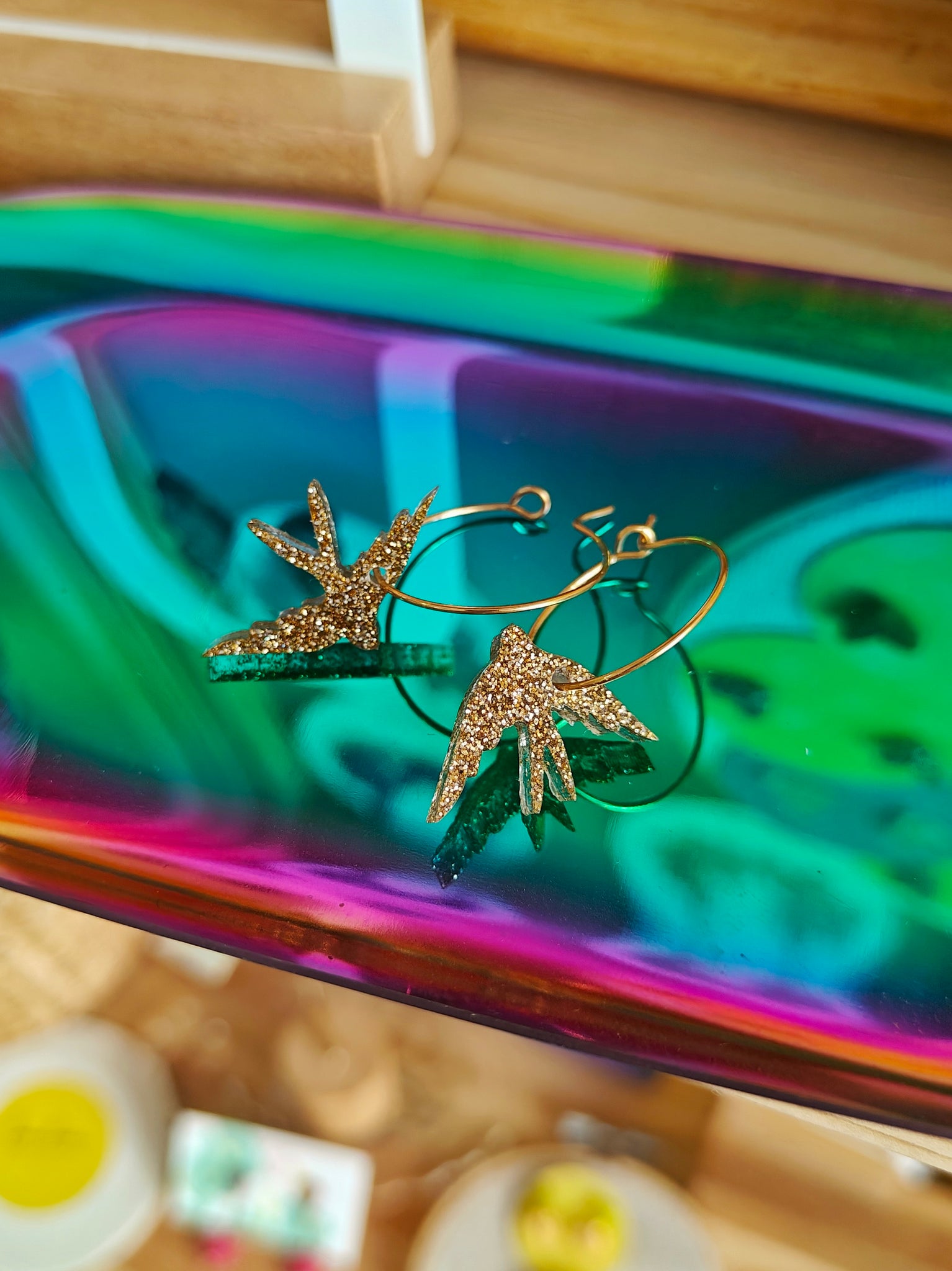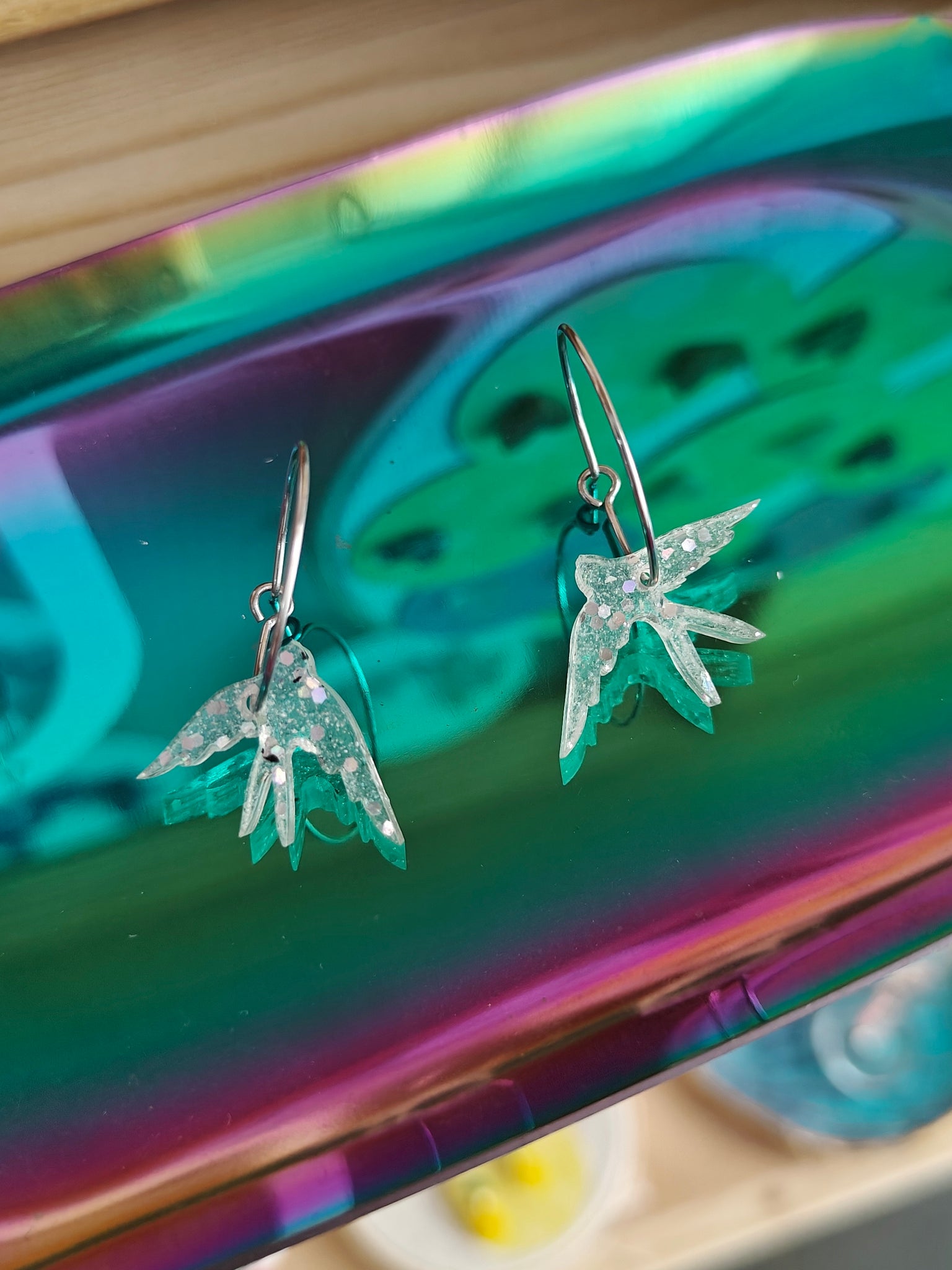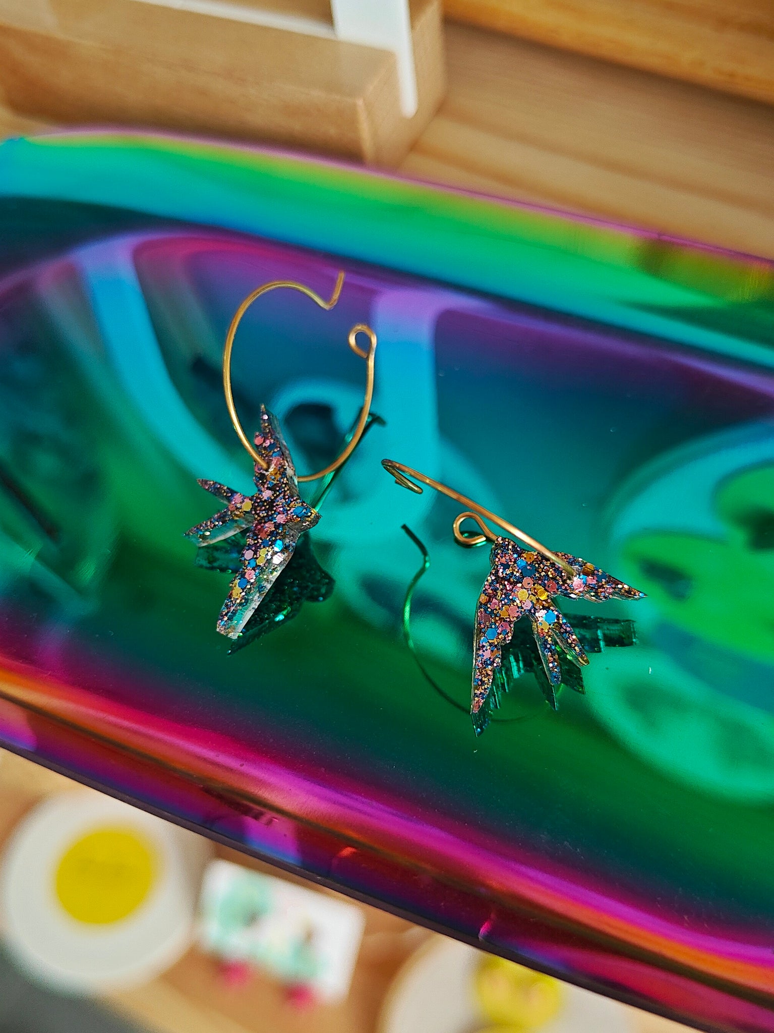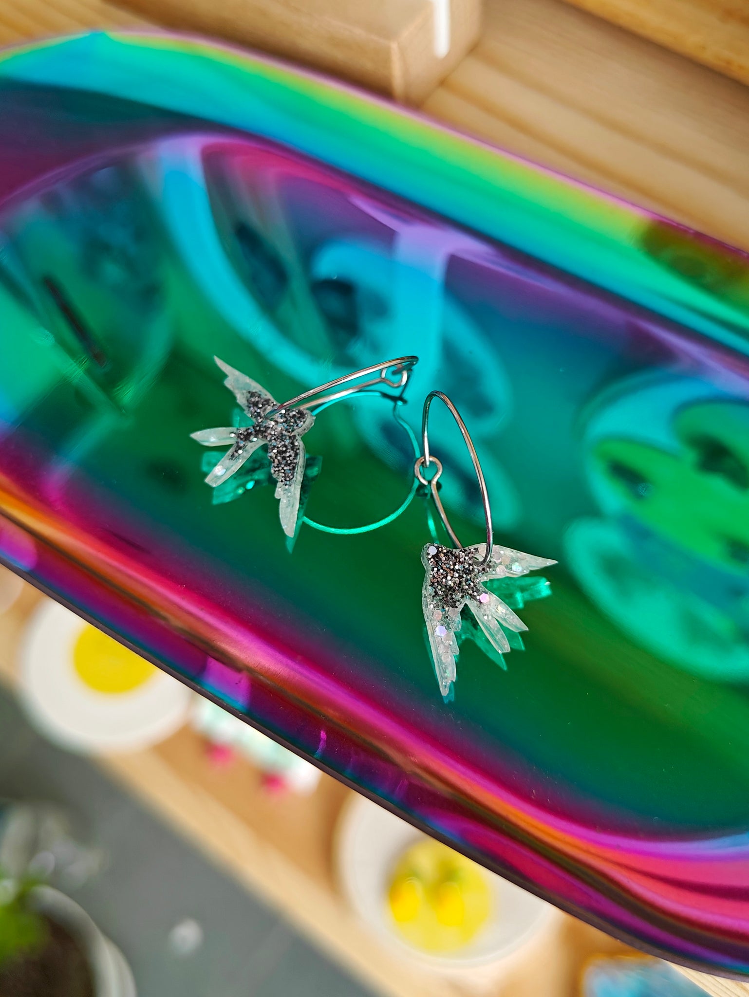 *Cada pieza está pigmentada y mezclada a mano individualmente por lo que los colores pueden variar. No hay dos pendientes iguales. El par de la imagen es solo una muestra. A veces el pendiente puede contener minúsculas burbujas de aire, tranquila no afectan a su uso.*